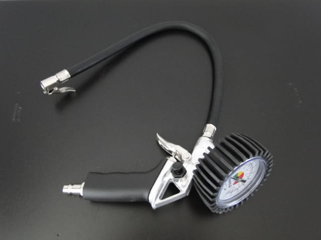 Profesjonalny pistolet do pompowania wyposażony w manometr, który umożliwia kontrolę ciśnienia powietrza w pompowanym produkcie, oraz aluminiowy korpus z antypoślizgowym uchwytem.
