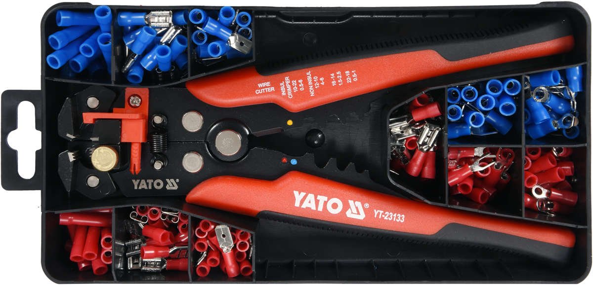 Zestaw konektorów izolowanych z wielofunkcyjnymi szczypcami YT-23133. Korpus szczypiec wykonano ze stali A3, a elementy ściągające izolację z wytrzymałej hartowanej stali narzędziowej ze stopu Cr12MoV. Rękojeści zabezpieczone dwukomponentowymi nakładkami z tworzywa sztucznego. Twardszy komponent z PP mocno przylega do korpusu, a zewnętrza część z TPR jest przyjemna w dotyku i posiada antypoślizgowe właściwości. Szczypce zabezpieczono przed korozją za pomocą metody oksydowania. Konstrukcja szczypiec umożliwia ściąganie izolacji zarówno z końcówek jak i ze środka przewodu. Ogranicznik głębokości sprawdza się podczas montażu przewodów np. w łącznikach czy w kostkach typu wago.