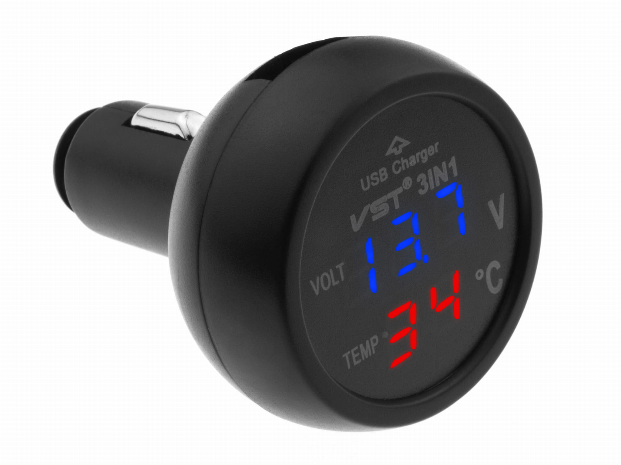 Multifunkcyjne urządzenie 3w1 z wbudowaną ładowarką o natężeniu 2.1A z dodatkową funkcją pomiaru poziomu napięcia elektrycznego akumulatora oraz termometrem. Posiada czytelny wyświetlacz LCD.